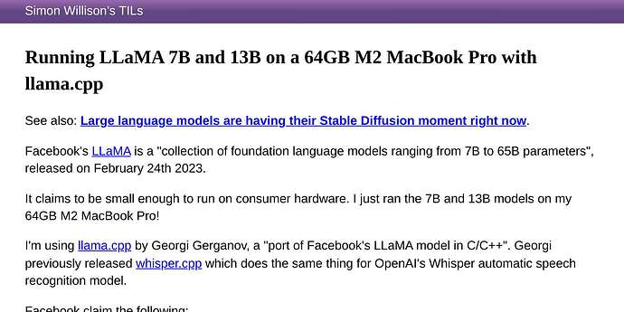 Running LLaMA 7B and 13B on a 64GB M2 MacBook Pro with llama.cpp